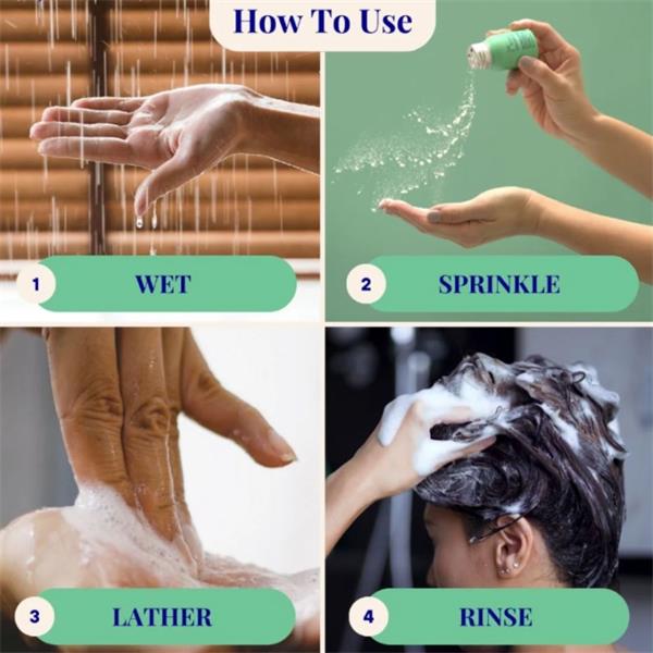 • Shake a small amount of powder into your palm or directly onto wet hair.